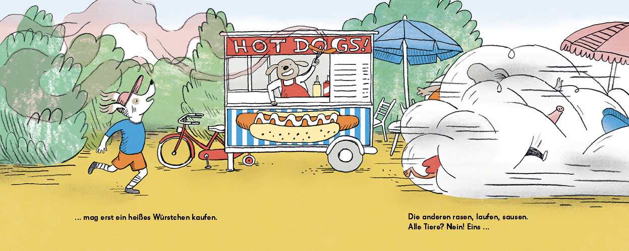 Achtung, das Wettrennen beginnt! Keiner, der hier nicht mitflitzen will: Bär und Nashorn, Schnecke, Ente, Elefant und - na klar - die schnellen Hasen. Alle starten, rennen, rasen durch den sommerlichen Park, alle wollen Erste sein. Es sei denn ... es tanzen plötzlich Seifenblasen durch die Luft, oder es duftet gut nach heißen Würstchen.