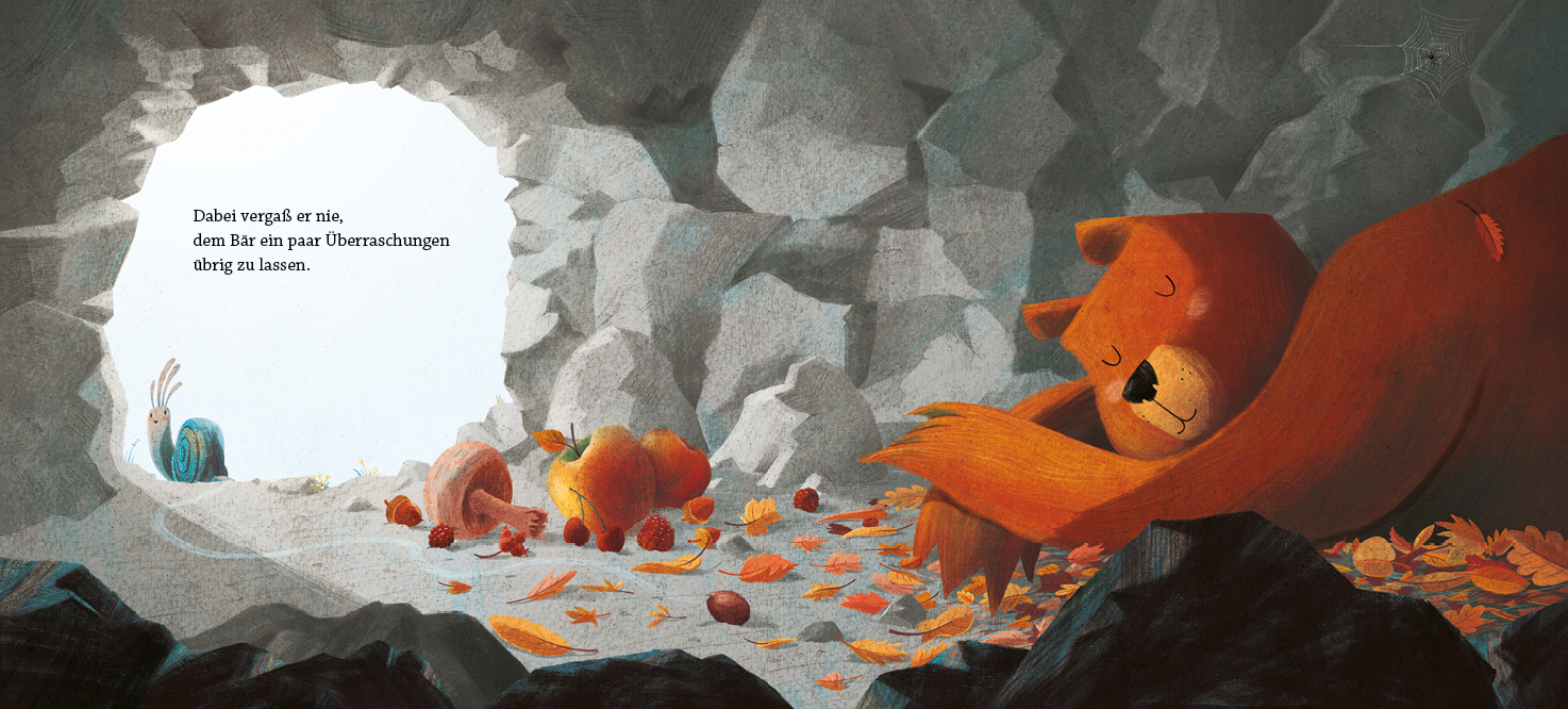 Denn erst, wenn der Bär sich zum Winterschlaf in seine Höhle gelegt hatte, erwachte der Schneck aus seinem Sommerschlaf. Immer, wenn der Bär erwachte, fand er die Leckerbissen, die der Schneck für ihn bereitgelegt hatte.