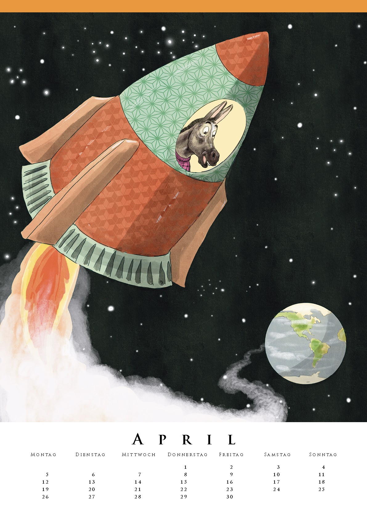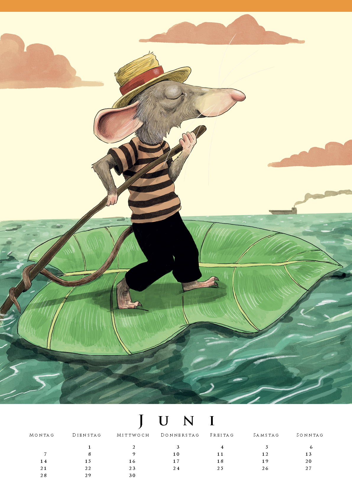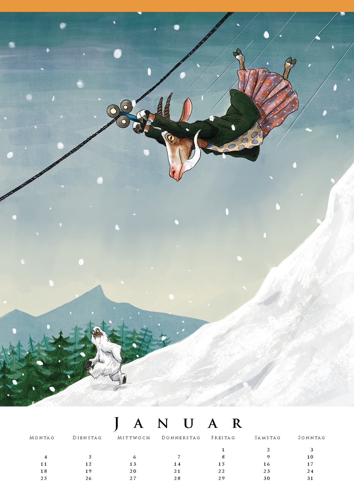 Alle sind unterwegs in diesem Kinderzimmerkalender und zwar auf höchst ungewöhnliche Weise: Die Ziege steigt nicht zu Fuß den Hang hinunter, sondern rast übermütig an der Seilbahn baumelnd ins Tal. Der Wal dagegen genießt die Fahrt bergauf im Geländewagen und die Katze erkundet die Unterwasserwelt tatsächlich mit dem U-Boot!