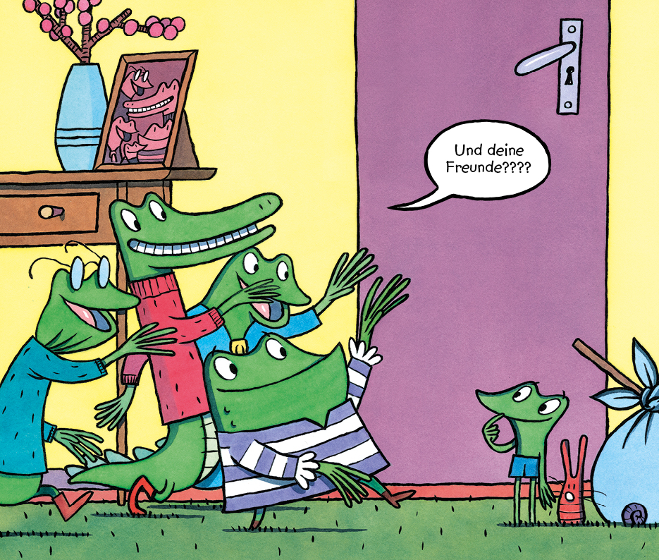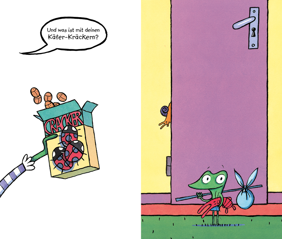 Aber seine Käfer-Kräcker braucht er schon, finden die Freunde. „Naaa gut", sagt der kleine Frosch. Und auch ganz wichtig: Limo, Zahnbürste, Regenschirm, Ping-Pong-Kellen, Lieblingsbuch ... Herrje, jetzt kann der kleine Frosch sein Bündel nicht mehr tragen!